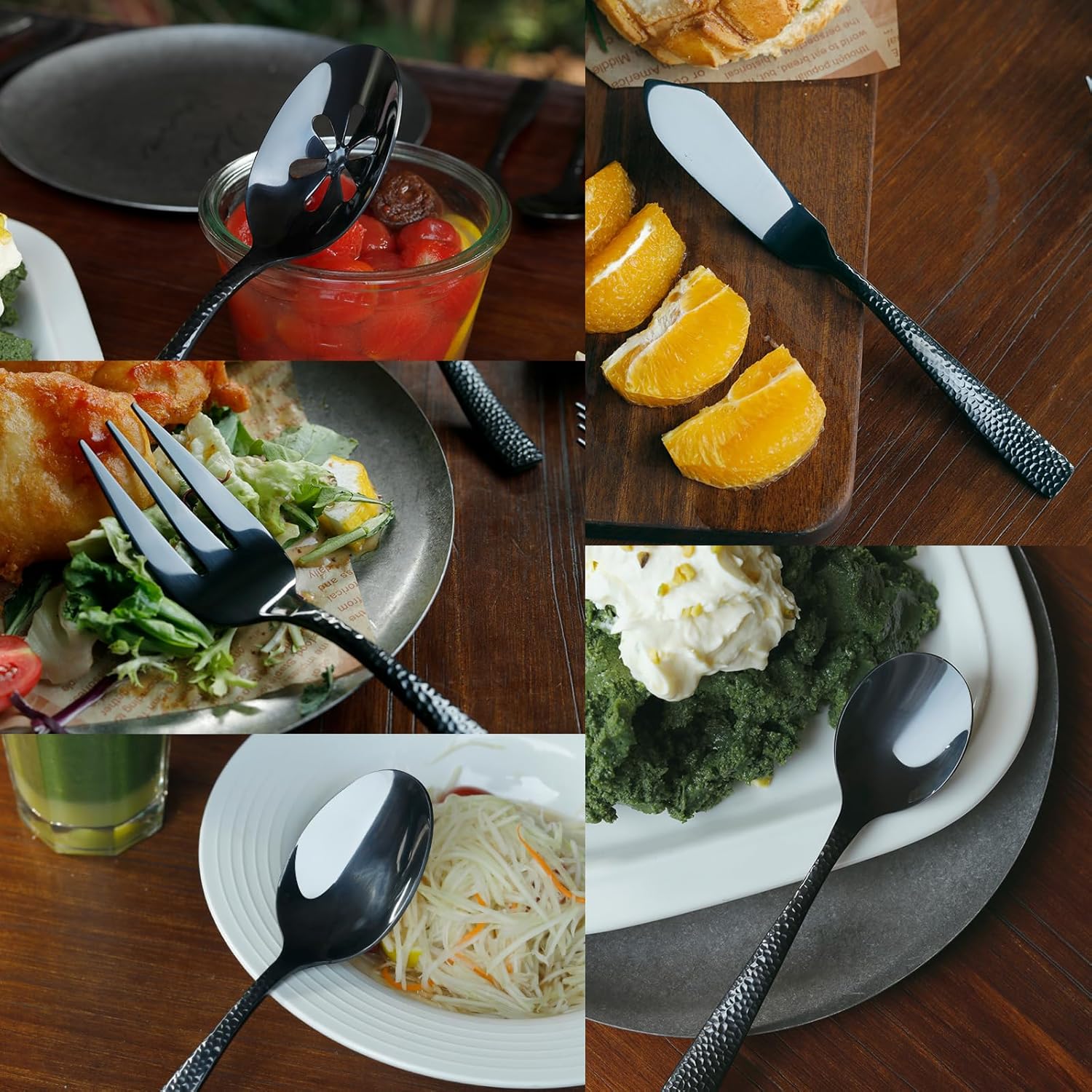 Silverware 65-Piece Black Hammered Flatware Set with Serving Utensils Stainless Steel Thick Handle Mirror Polished Cutlery Set for Wedding Hotel Restaurant, Service for 12