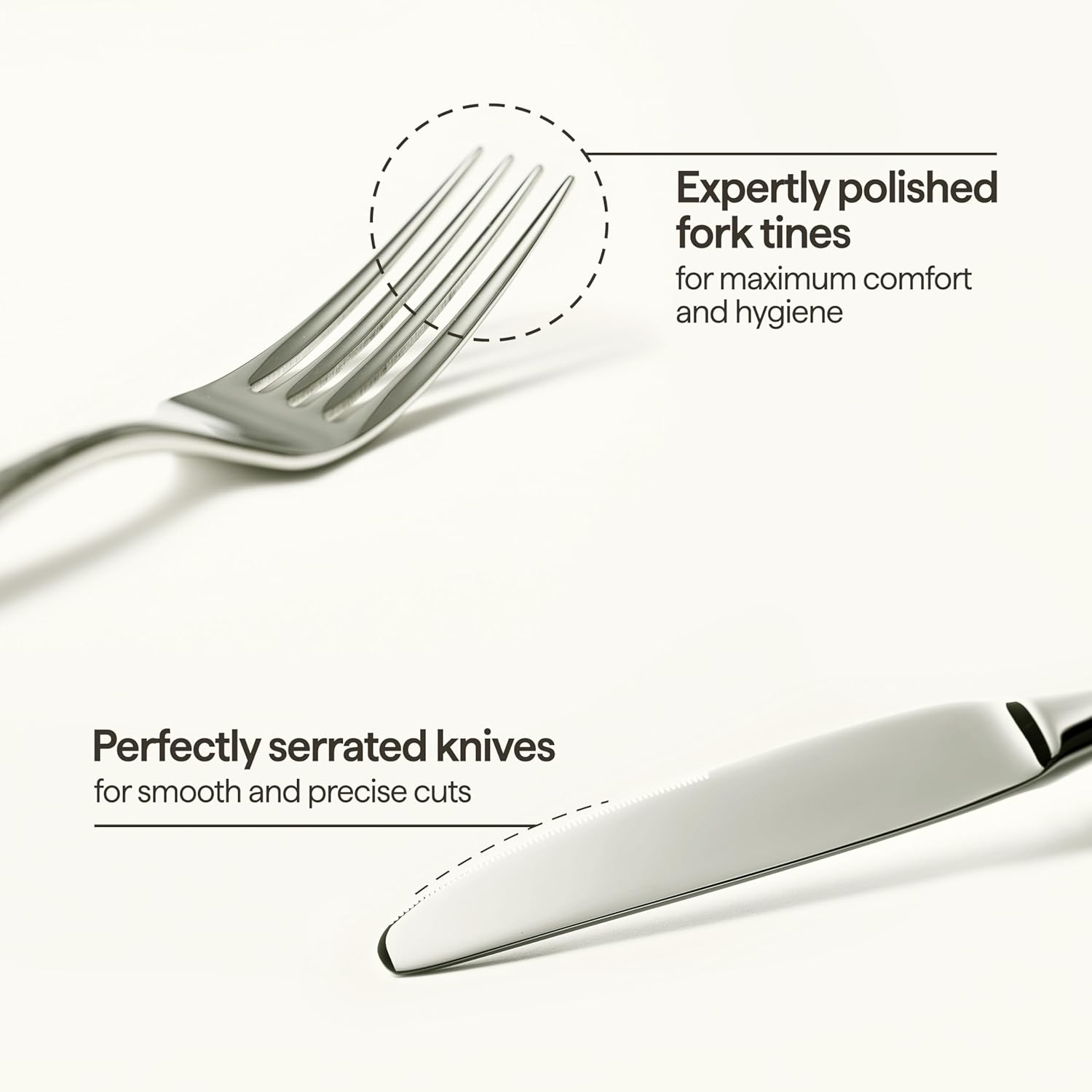 - Designed for Comfort & Precision: Experience an elegant and well-balanced kitchen flatware set crafted with the optimal thickness for a sturdy, premium feel. The smooth, rounded edges ensure a comfortable grip, while the precisely serrated dinner knives offer effortless cutting, making every meal feel like a fine dining experience.