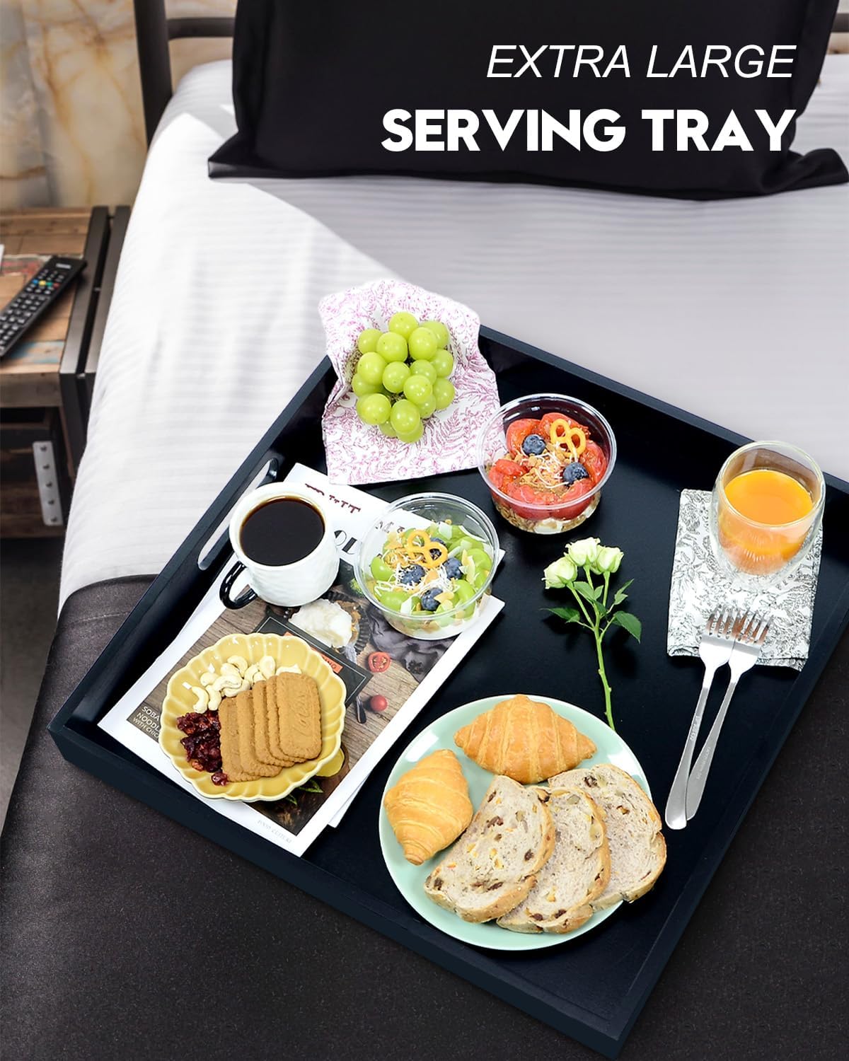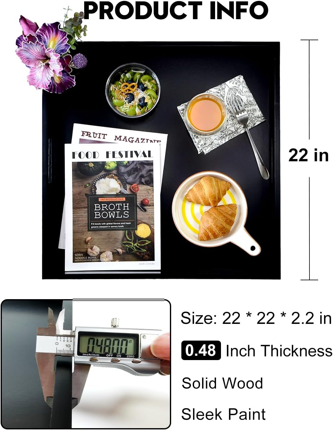 22 Inches Square Wood Ottoman Tray Black, Extra Large Wooden Serving Tray with Handles for Living Room, Serving Food Breakfast, Ottoman Coffee Table Couch Sofa Kitchen