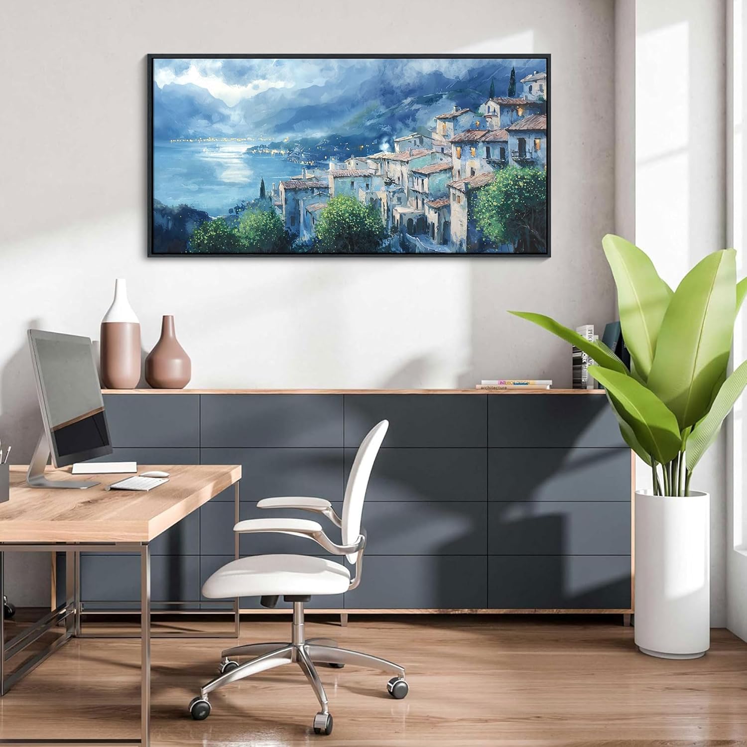 JEAWA Framed Canvas Wall Art - 20x40 IN Landscape Painting Decor Ready to Hang, Gray Blue Town Picture, Lights of Thousands homes Art Prints for Bedroom Bathroom Home Decoration