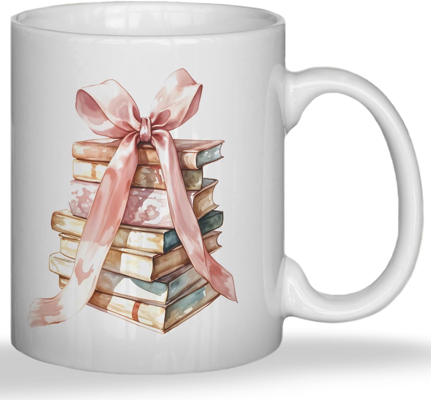 JINYO Coquette Pink Bow Books Mug, Book Coffee Cup, Reading Mugs for Book Lovers, Gifts for Readers Books Lovers Women, Bookish Bookworm Gifts for Women, Ceramic Coffee Tea Mug 11 oz