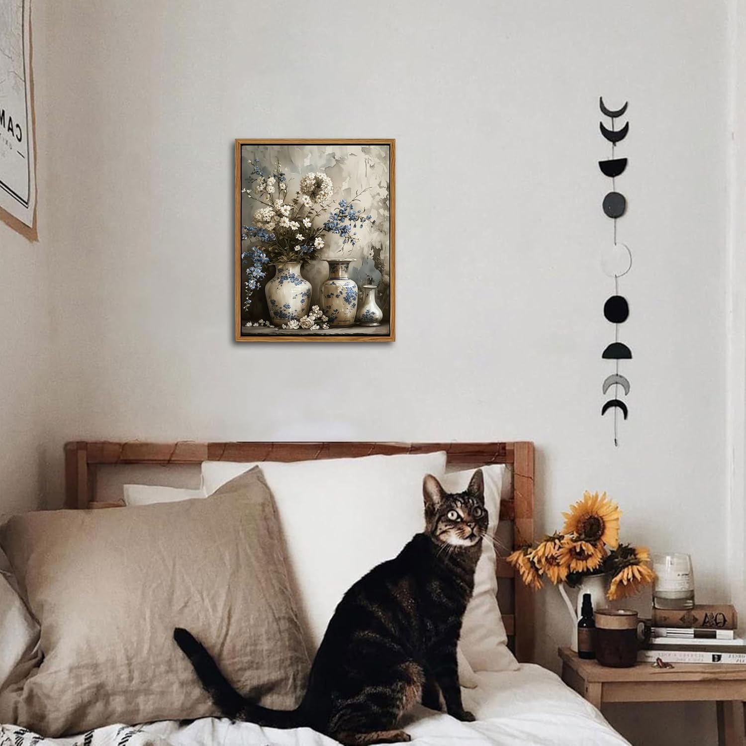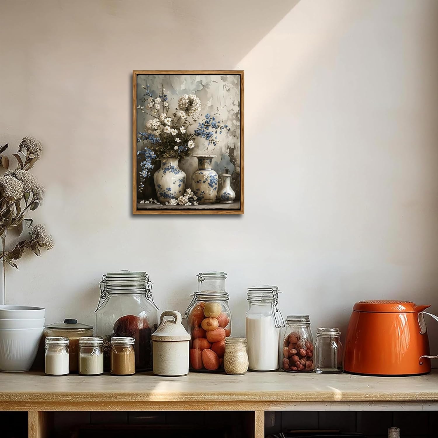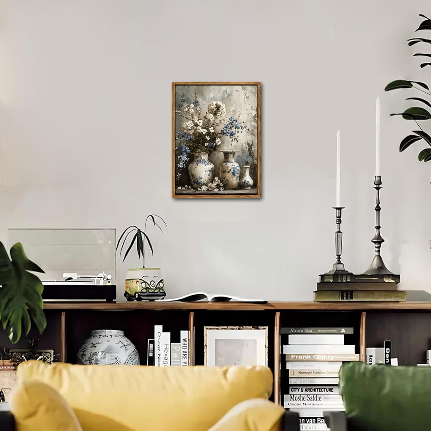 Floating Framed Farmhouse Floral Canvas Wall Art, Vintage Blue and White Flower Pictures Wall Decor, Elegant Art Jar Posters Print for Living Room Bedroom Bathroom Rustic Decor 8x10 inch