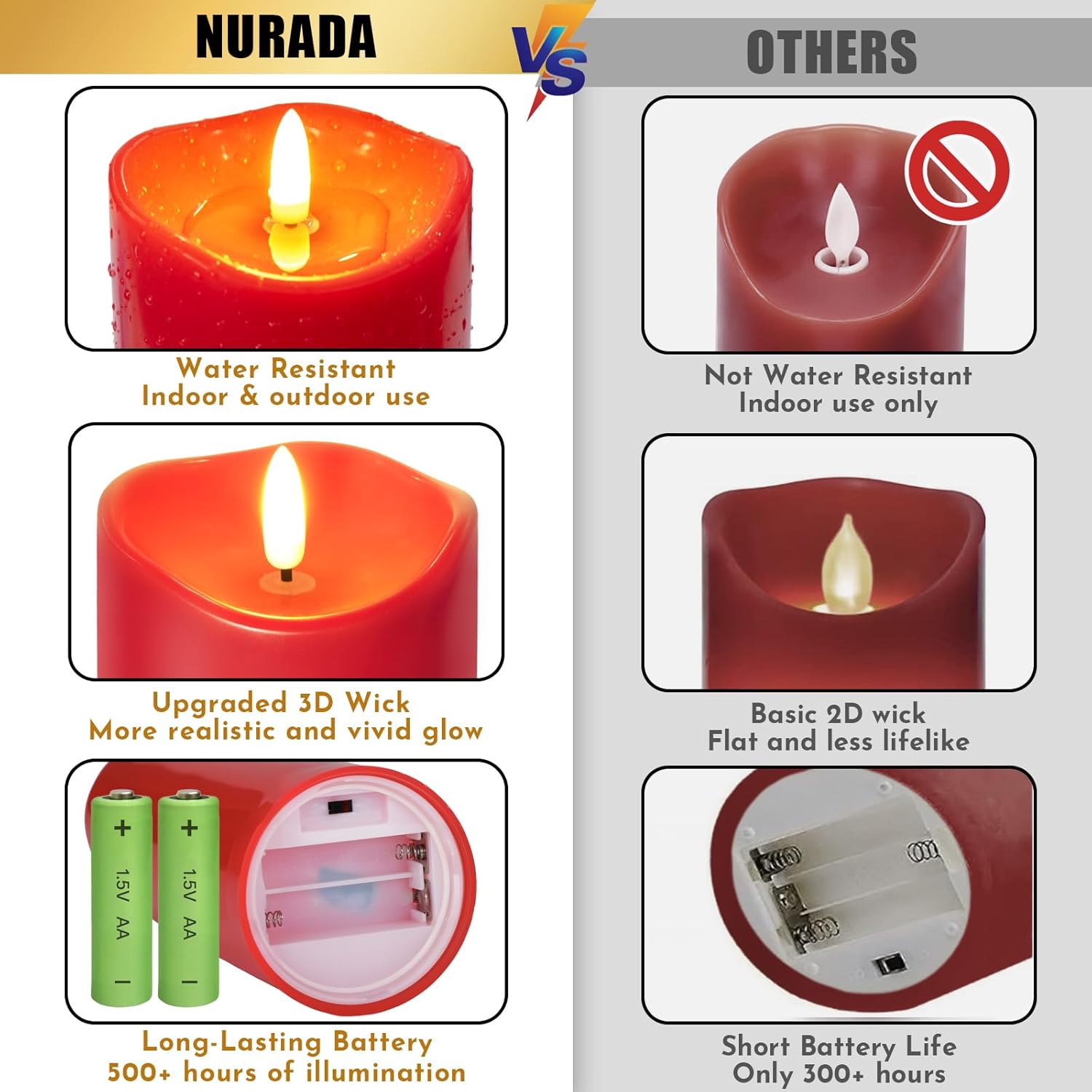 - IP44 Outdoor Waterproof Flameless Candles: Made from durable, thicken, waterproof plastic and Eco-Wick, they feature a solid screw-in waterproof base and sealing gasket to hide the main accessories inside the waterproof shell,ensuring long-term use in outdoor and indoor settings. Perfect for decorating patios, porches, home, fireplace, bedroom and table centerpieces. Unlike traditional candles, these electric candles don't melt or warp in different weather conditions