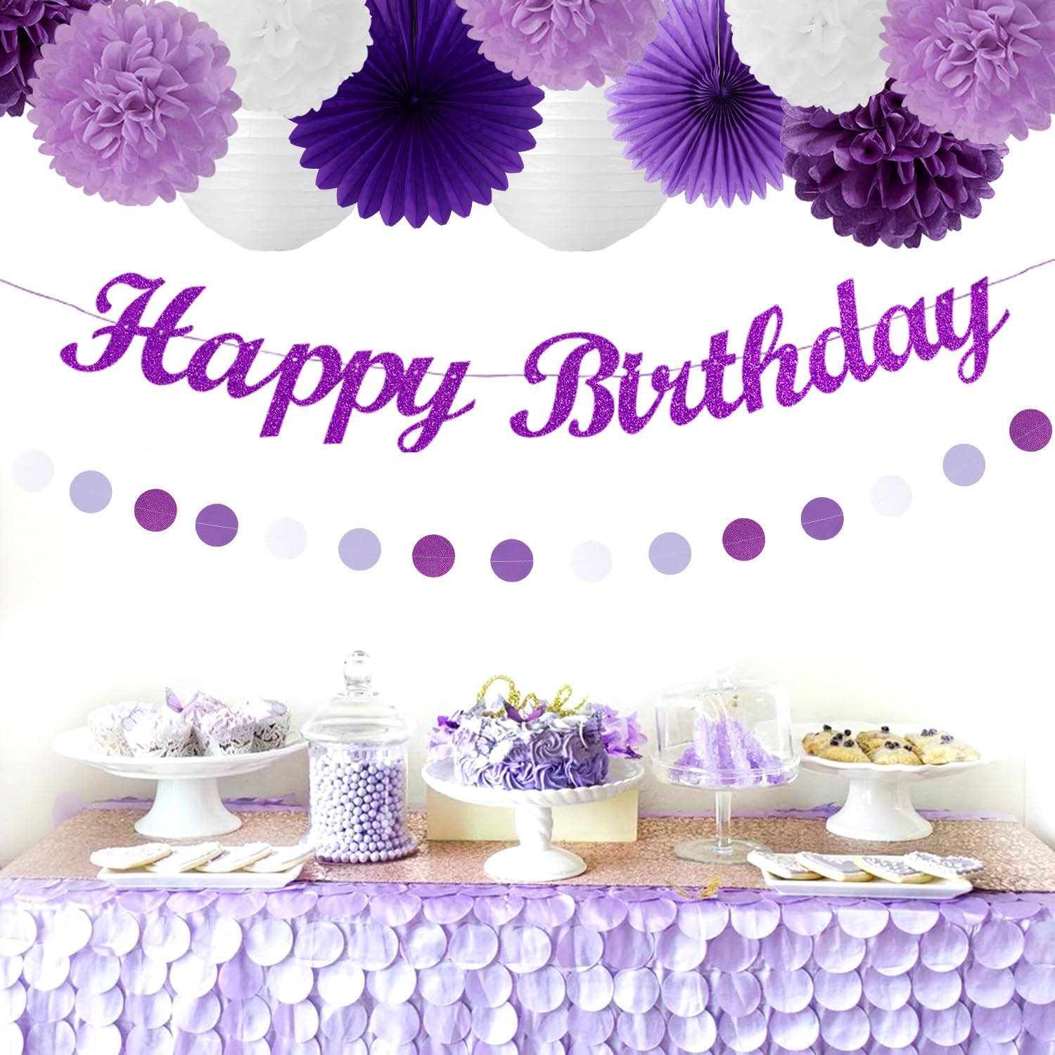 Purple White Birthday Party-Decorations Paper-Flowers - 14pcs Happy Banner Lavender Lanterns Tissue Pom Poms,Lilac Streamers Garland Fans,Women Girls Adult Kids Office Hanging Supplies Decor Hugfond