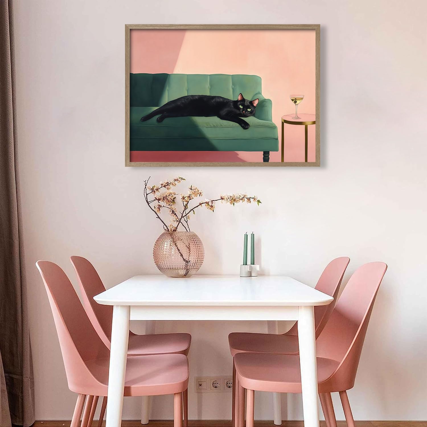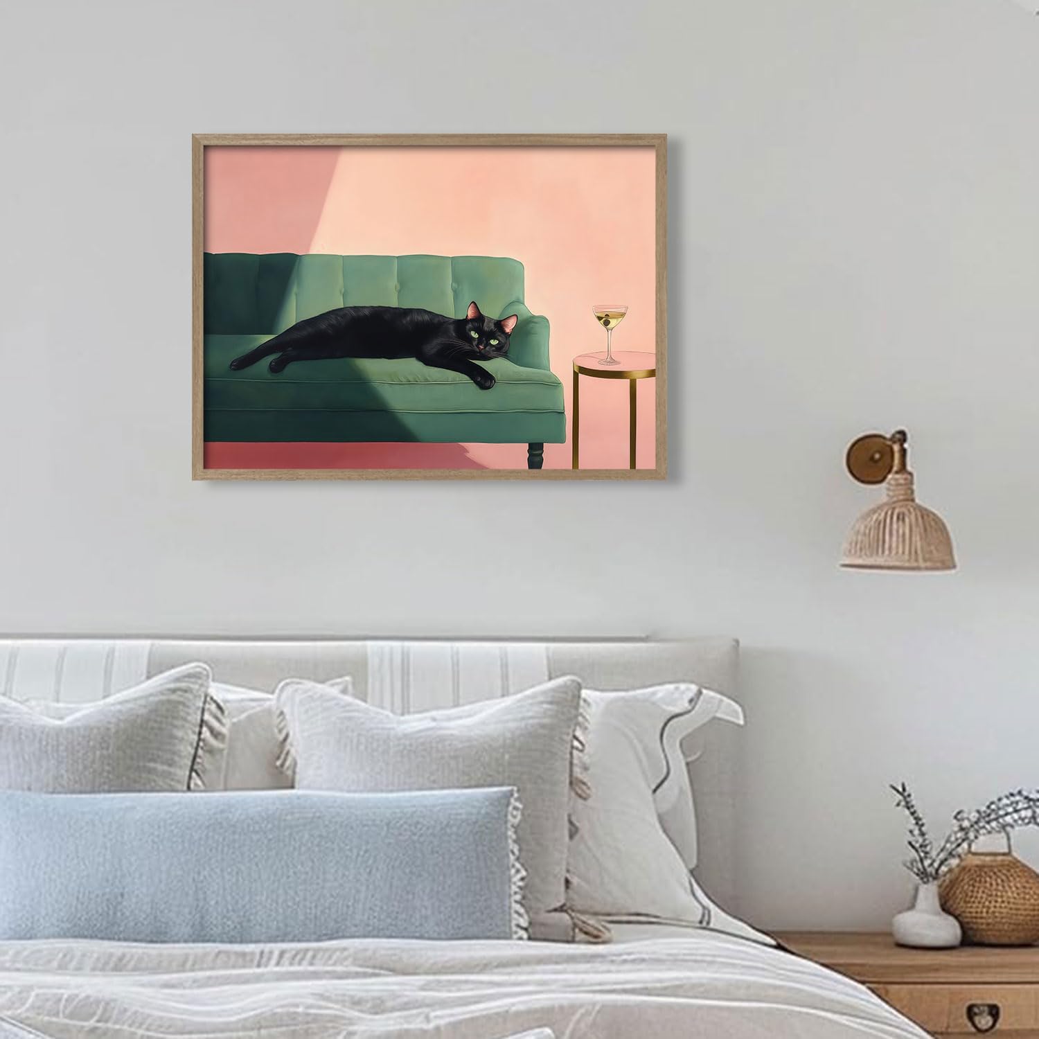 - Casual Style Black Cat Art: This painting shows a black cat lazily lying on a green sofa, with a warm pink background, giving any space a relaxing and pleasant atmosphere, perfect for modern homes.