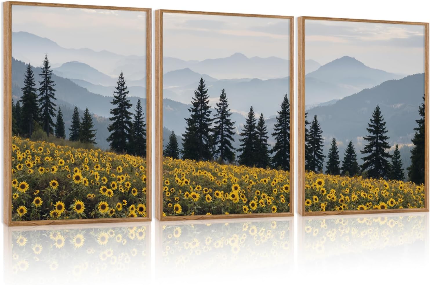 - 【Alpine Sunflowers Wall Art】The size of the rustic mountain landscape framed canvas wall art set is: 16x24 inchx3pcs (40x60cmx3pcs).Modern Wildflower prints artwork use high-quality environmentally friendly ink and high-quality canvas, and use the industry's top printers for layered spraying, the colors are delicate and the transition is natural.bring you visual enjoyment.