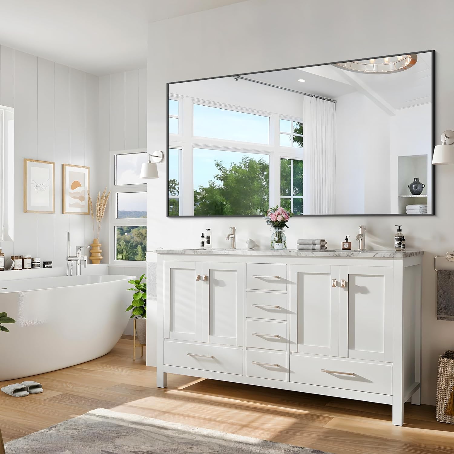 - HORIZONTAL OR VERTICAL HANGING: The 4 mounted keyholes allow for horizontal or vertical hanging; bathroom mirror comes with nails, you can quickly complete the installation with the help of a drill and a screwdriver (no included)
