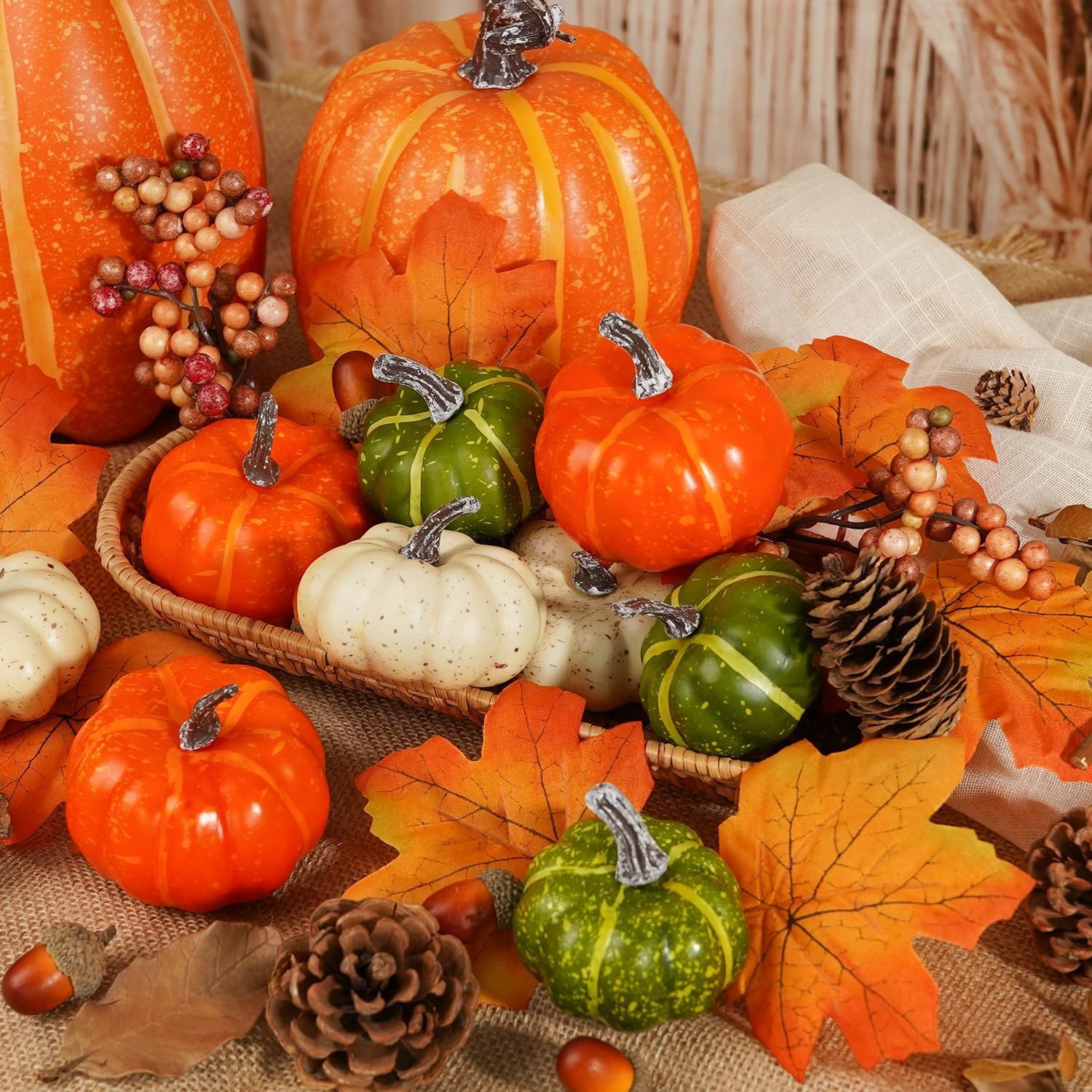 Artmag Pumpkin Decor Set, 25 PCS Fall Artificial Maple Leaves, Harvest Pumpkins, Acorns, Pine Cones and Orange Berry Stems Decorations for Fall Thanksgiving Table Decor