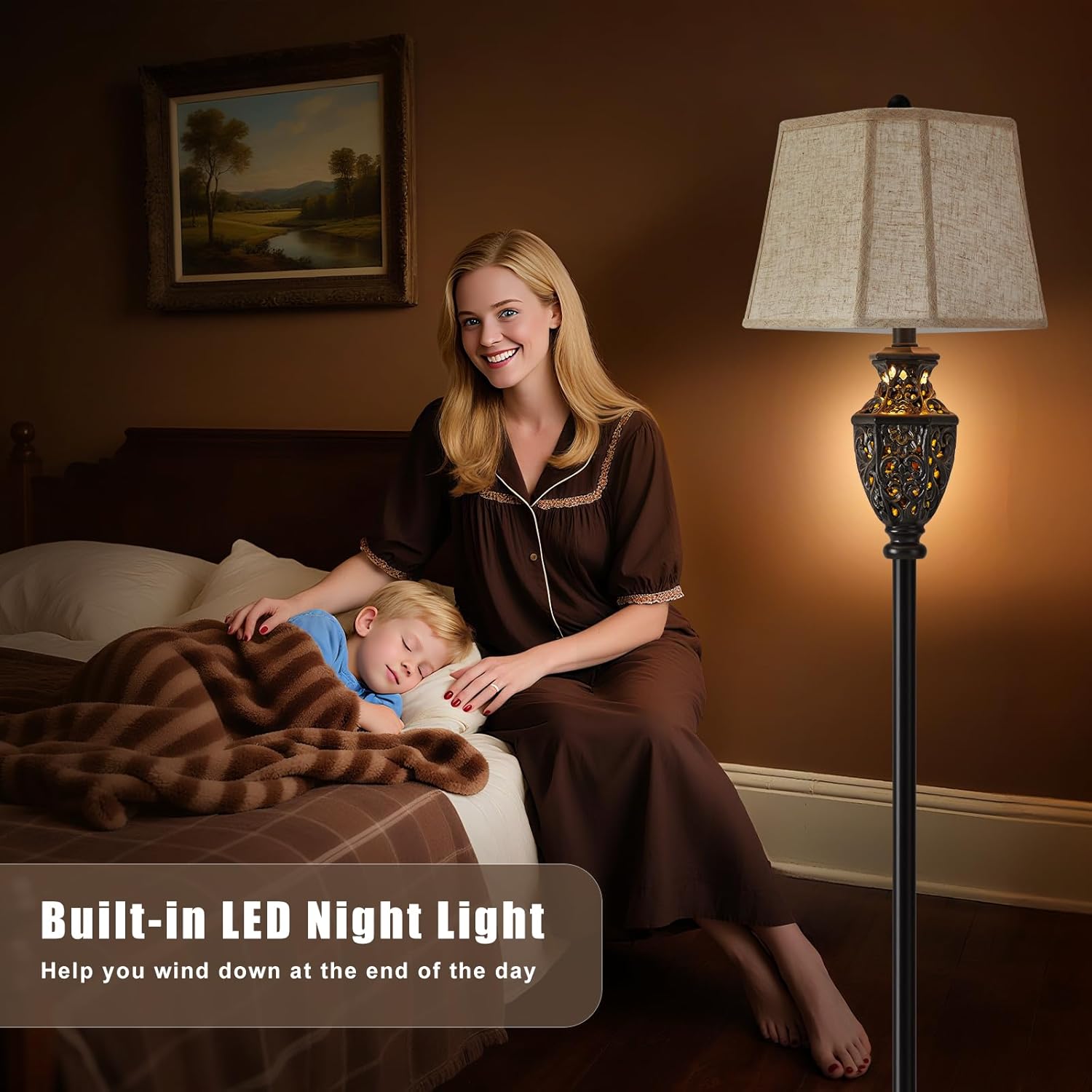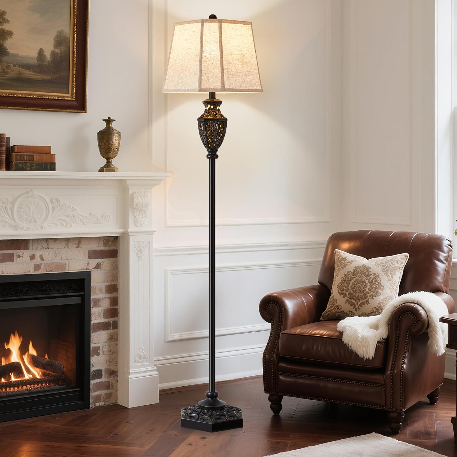 Luvkczc Vintage Black Floor Lamp - Hand-Painted Gold Resin with 6-Sided Carved Hollow Nightlight, Traditional Standing Lamp for Living Room, Bedroom, Study (Bulb Included)