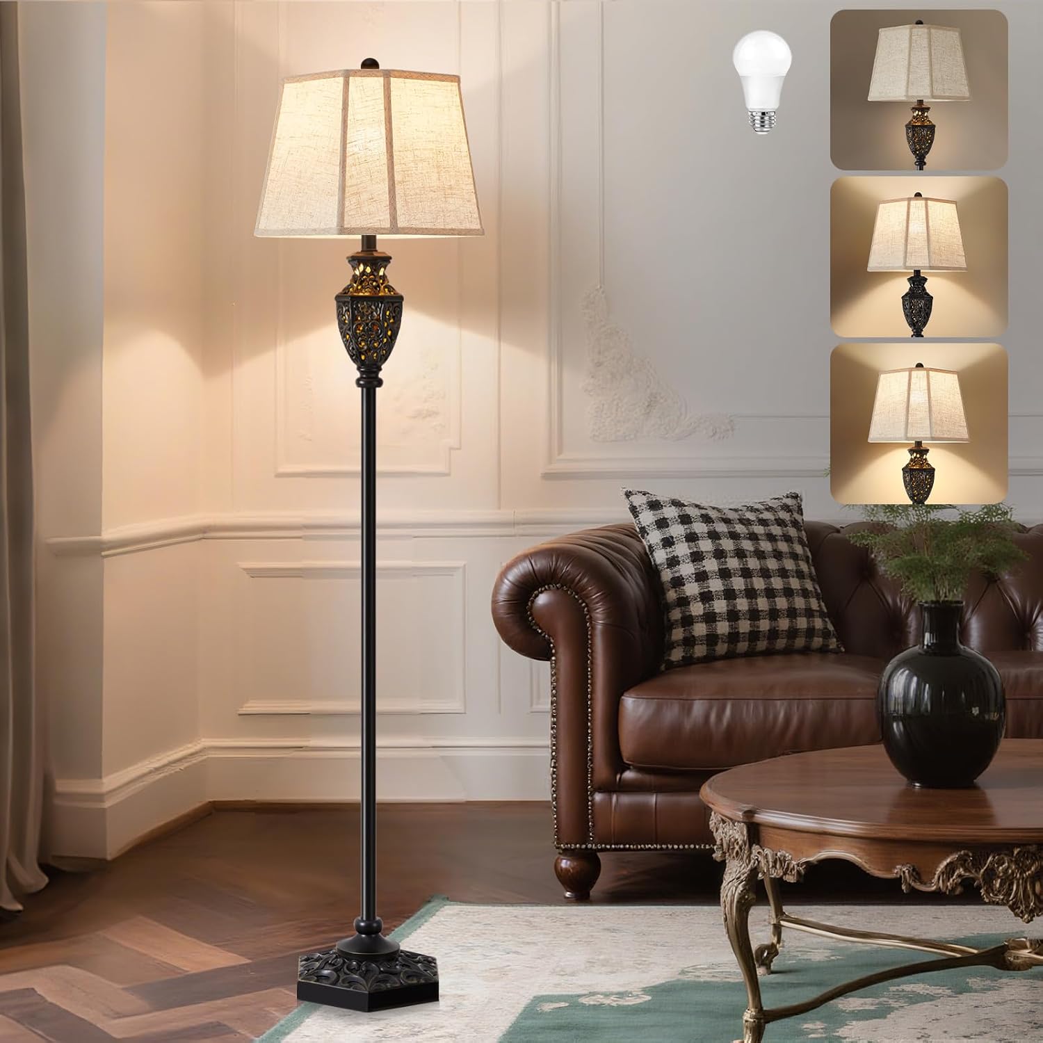 - IDEAL HEIGHT: Designed at the perfect floor lamp height to illuminate your space beautifully. The all-black body with gold detailing and fully carved design creates a sophisticated, sculptural focal point that enhances any room’s aesthetic from top to ornate base.