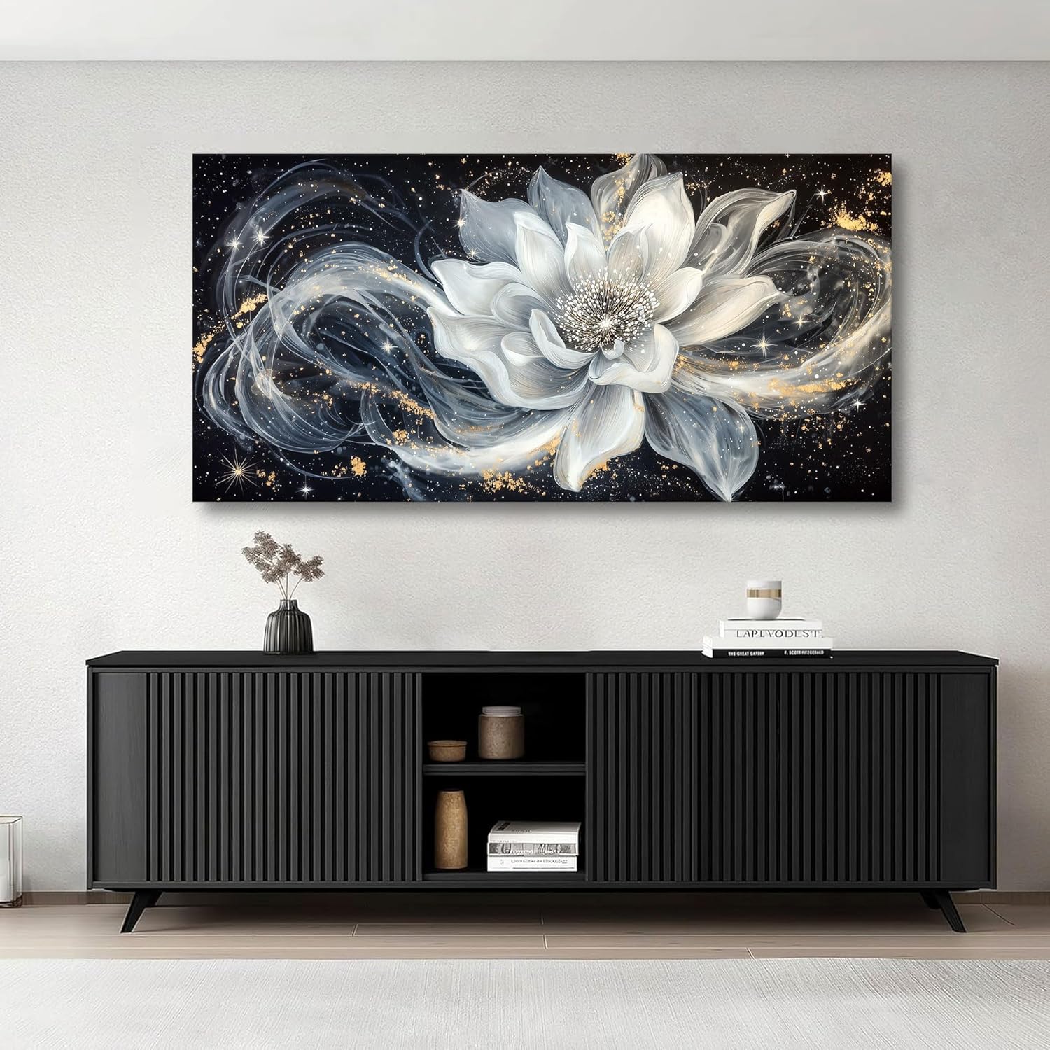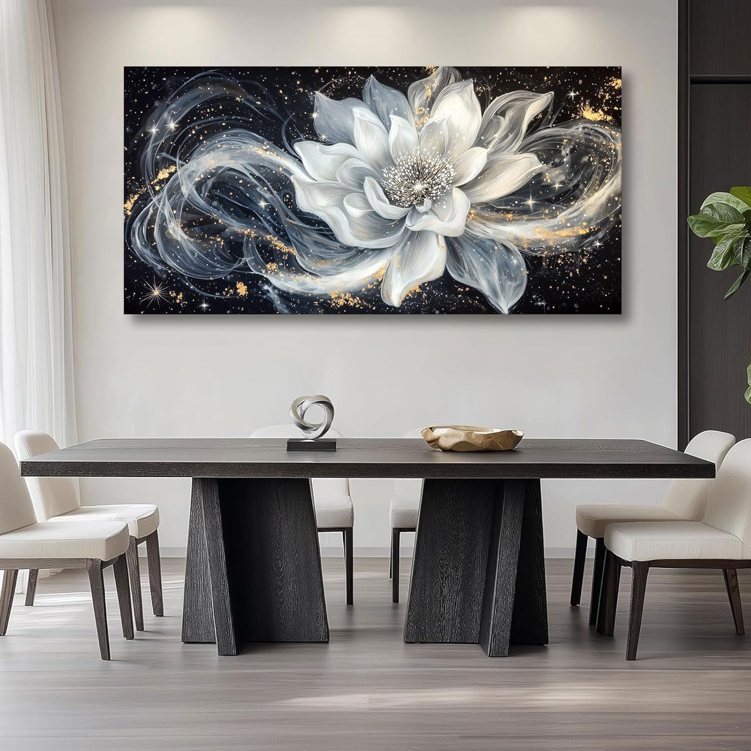 QZQCBLC Large Wall Art, Black and White Lotus Wall Art Modern Abstract Flower Pictures Gold Silver Canvas Painting Artwork for Living room Bedroom kitchen Home Office Decor 29x58 IN