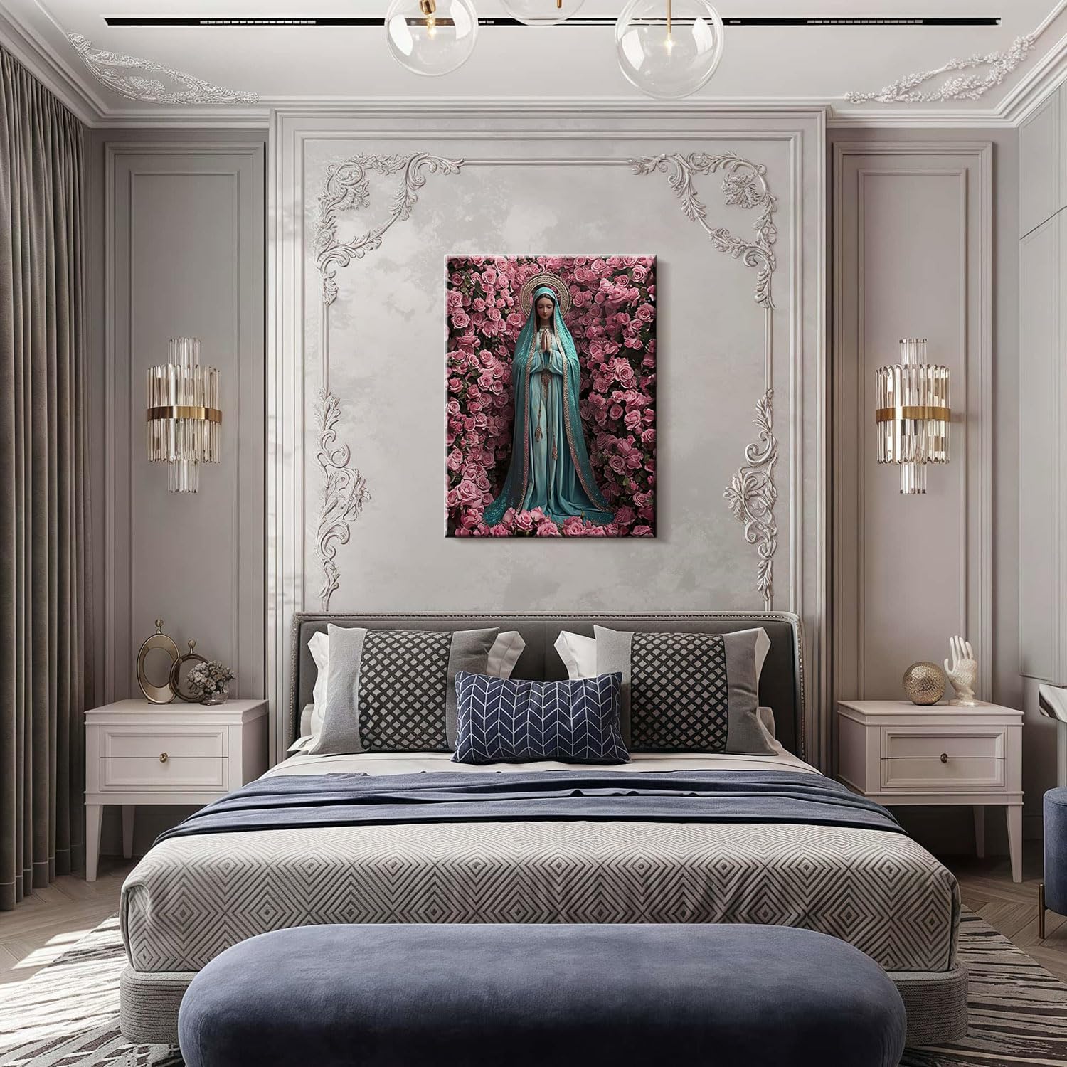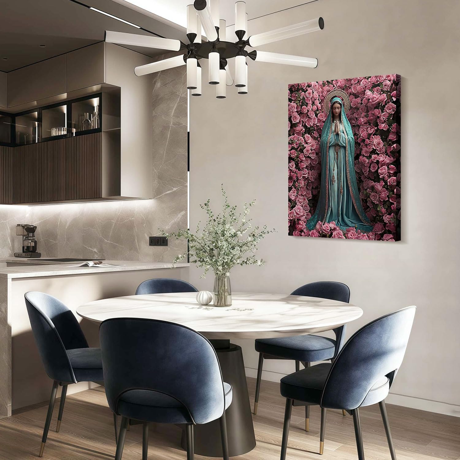 - Elegant and Spiritual Design – Features the Virgin Mary in a turquoise robe surrounded by vivid pink roses, symbolizing peace, grace, and divine beauty, ideal for any Christian or Catholic home.