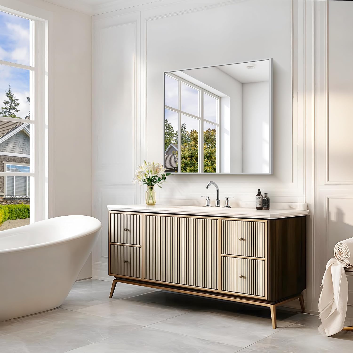 Silver Bathroom Mirror for Wall, 30x30 Inch Rectangle Mirrors with Metal Frame, Modern Vanity Wall Mirror Decor for Bathroom Living Room, Entryway Hangs Horizontal or Vertical
