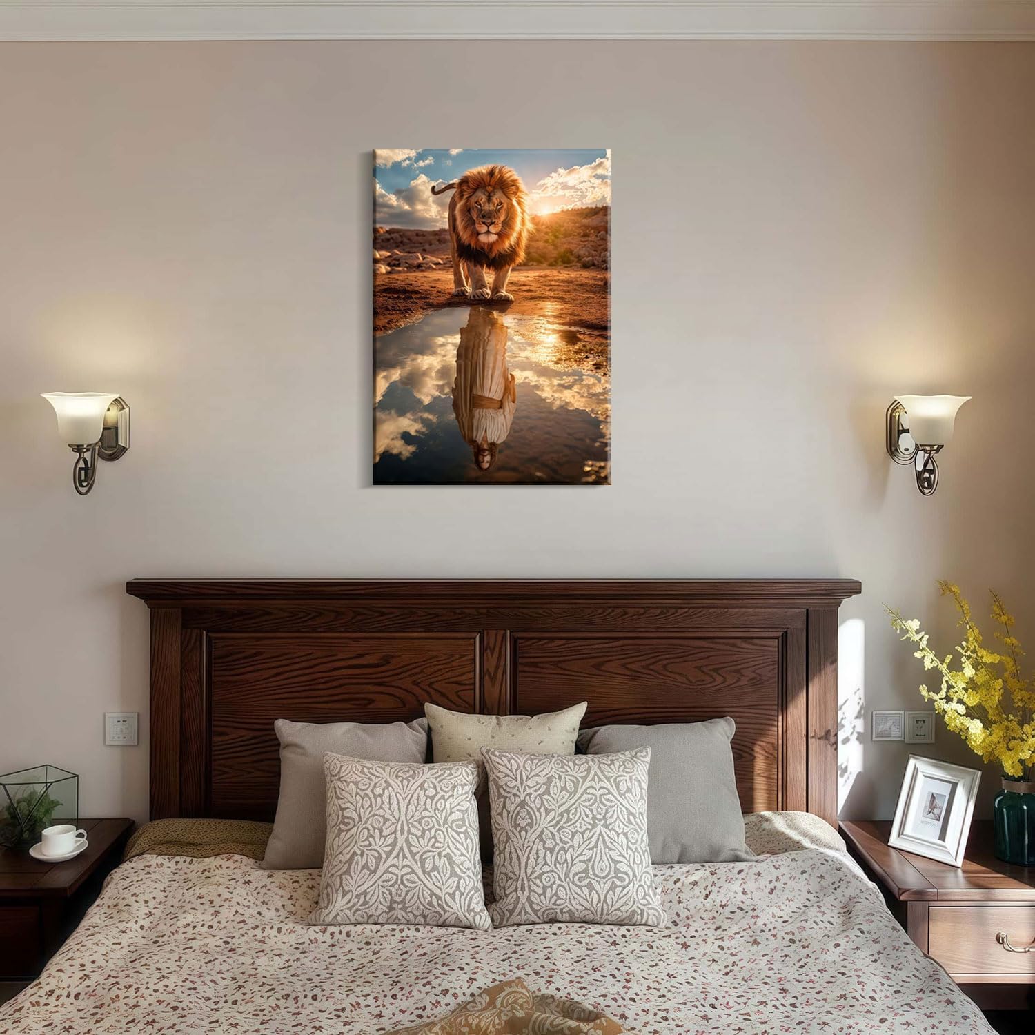 - Meaningful Faith-Inspired Art Featuring a powerful lion standing by a pool with the reflection of Jesus, this symbolic canvas wall art conveys themes of courage, faith, and inner strength.