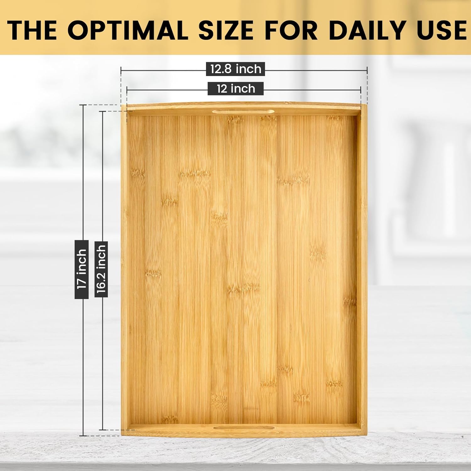 - LARGE SIZE:Our large bamboo tray (17" × 13" × 1.5") has a very large capacity. Its inner dimension (16.2" × 12") is more than enough to hold a 12-inch pizza, making it perfect for holding various foods and placing all kinds of items