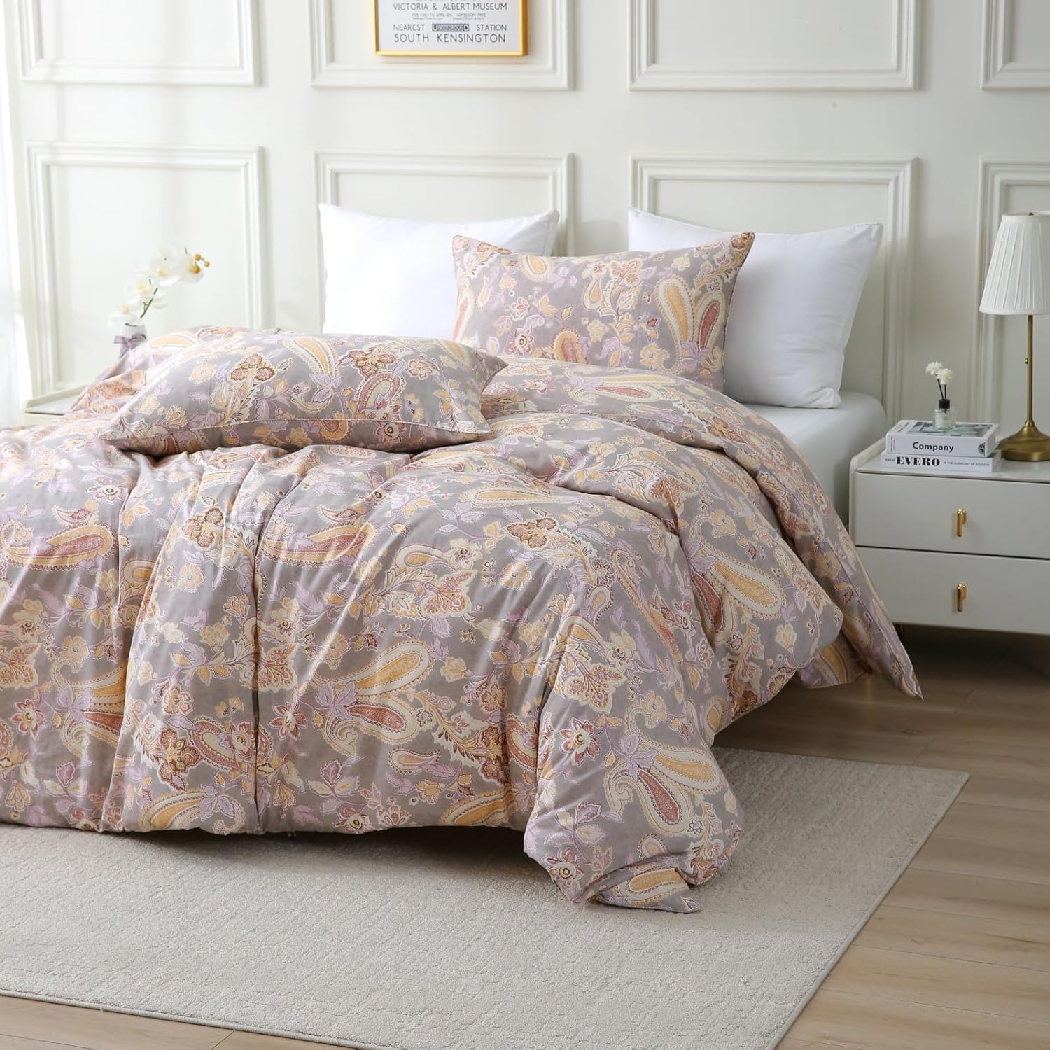 ABREEZE Paisley Bedding Sets 3Pcs Brushed Cotton Duvet Cover Set Queen Size Rustic Damask Gold Floral Comforter Cover with Zipper Closure Boho Bedding Collections