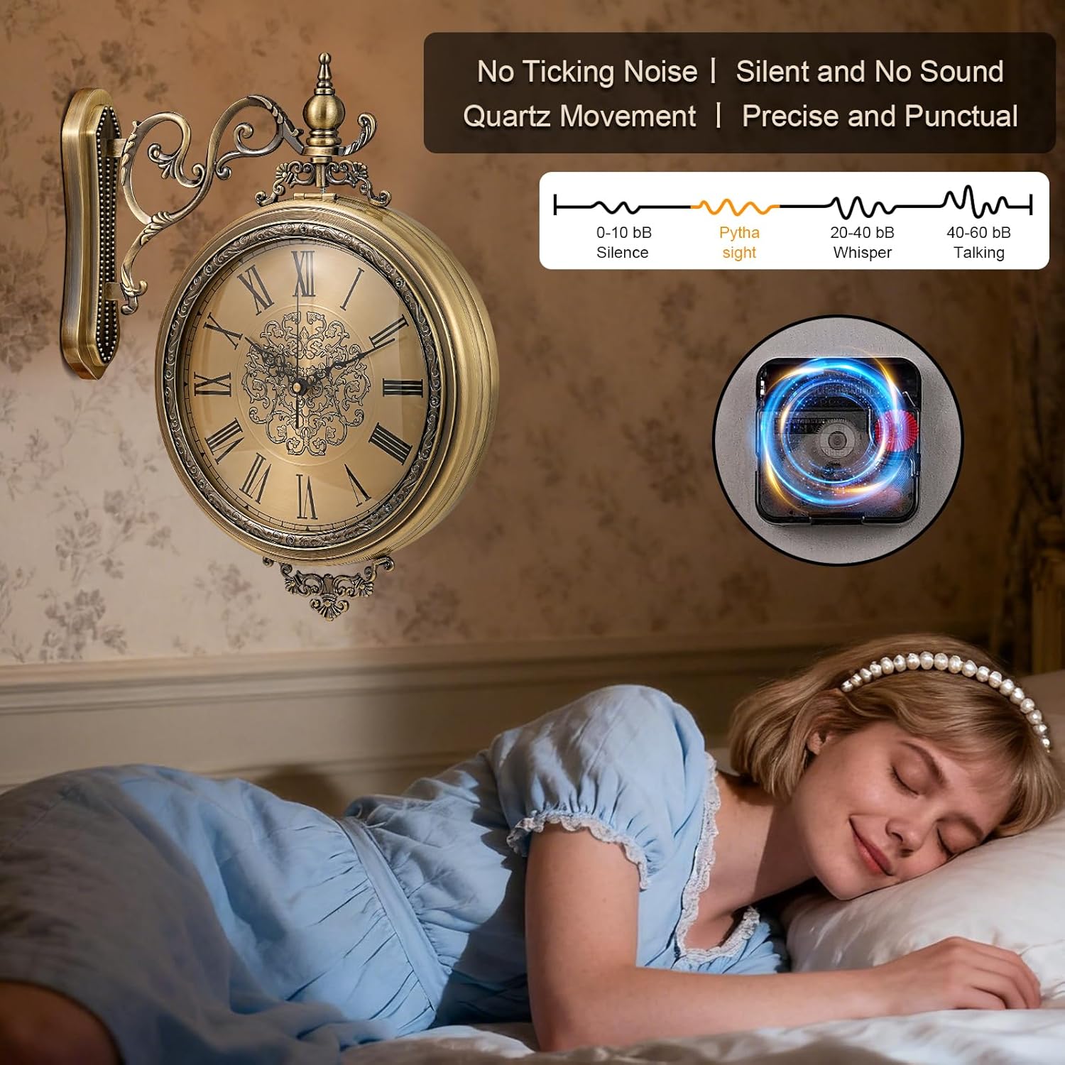 - đŻ [Double-Sided Vintage Design with Roman & Arabic Numerals] Admire classic elegance from any viewpoint. Our unique double sided wall clock displays sophisticated Roman numerals on one side and clear Arabic numerals on the other. This antique stationary design offers dual visibility in a stunning vintage package, making it a captivating hanging clock for your space.