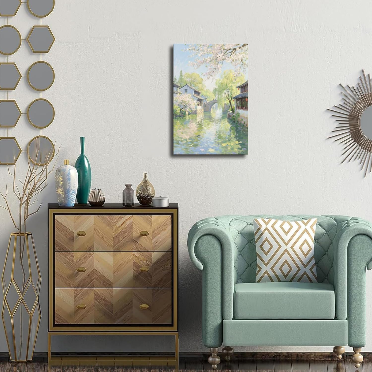 Small bridge stream house Jiangnan style landscape poster suitable for living room bedroom office natural oil painting poster