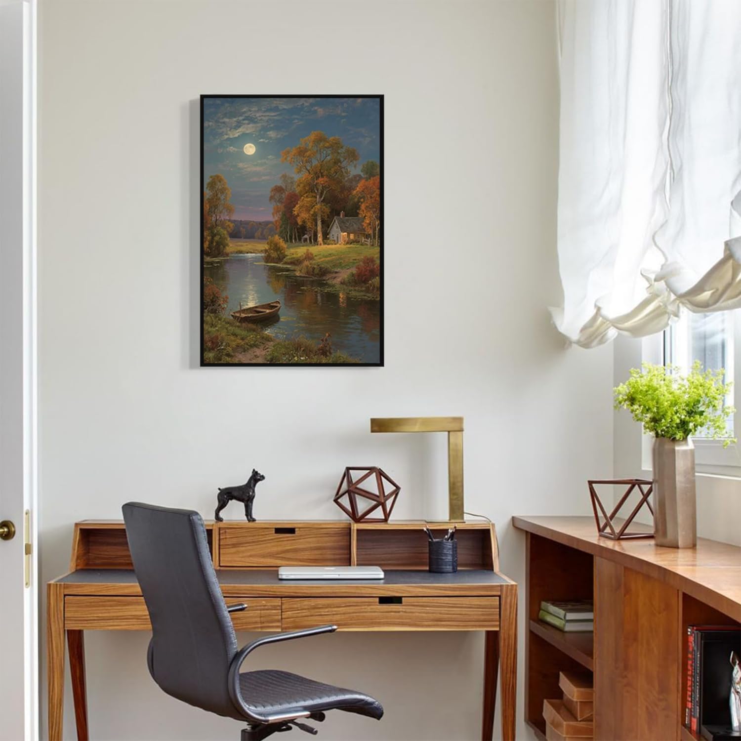 Small house by the stream under the moonlight tranquil style suitable for living room bedroom and office landscape poster wall art