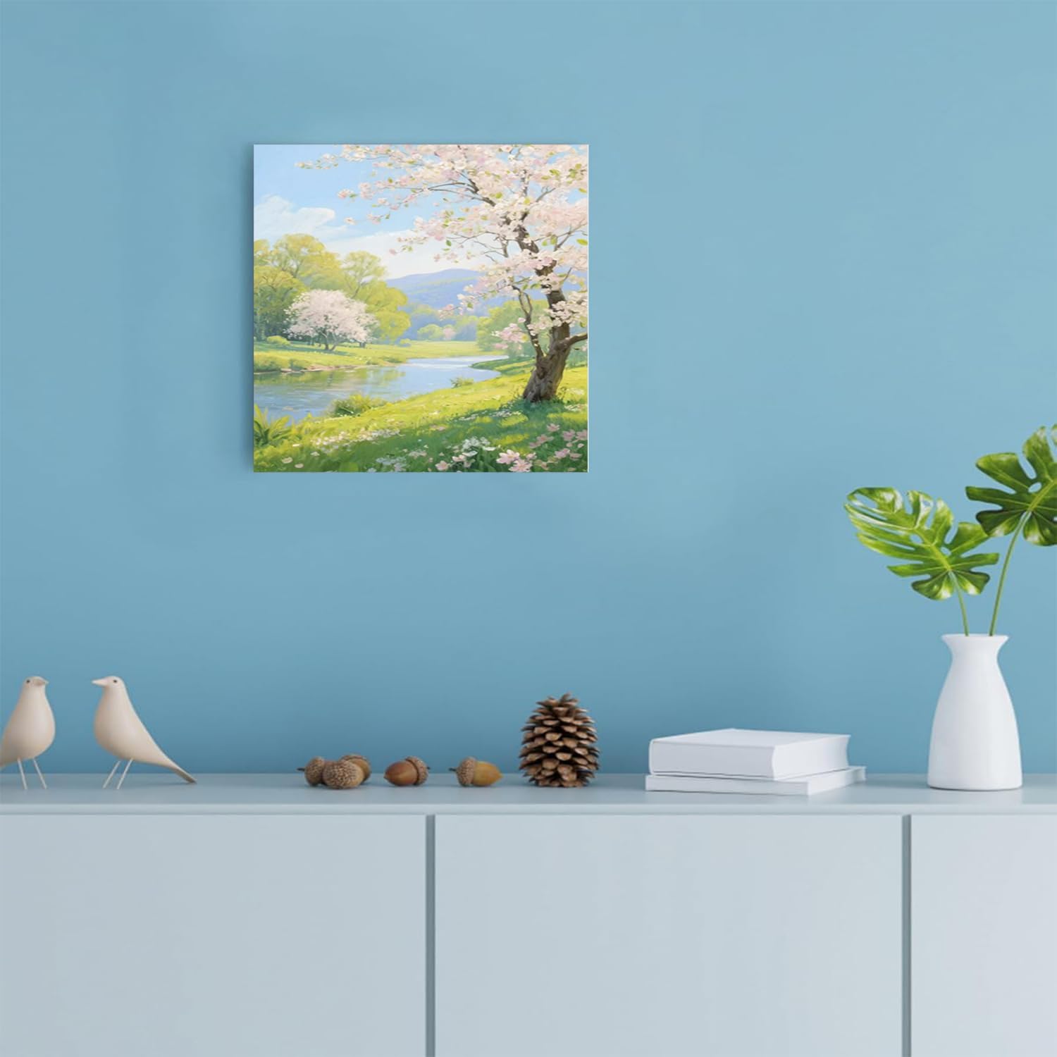 The scenery of a stream between trees and cherry blossoms under the blue sky is suitable for posting in the living room bedroom office landscape posters