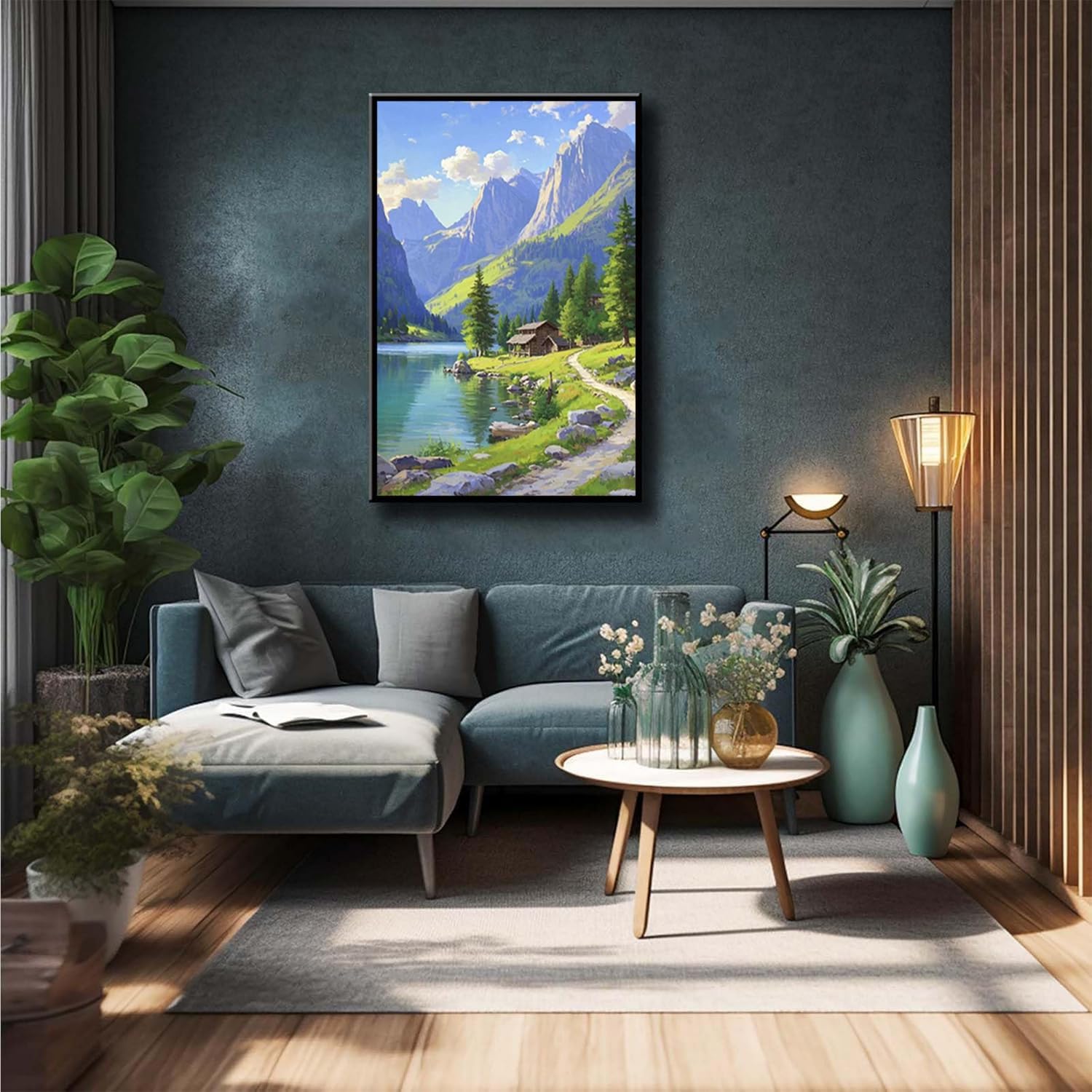 Landscape wall painting of mountain forest lakeside cabin under blue sky and white clouds natural oil painting poster suitable for living room bedroom office